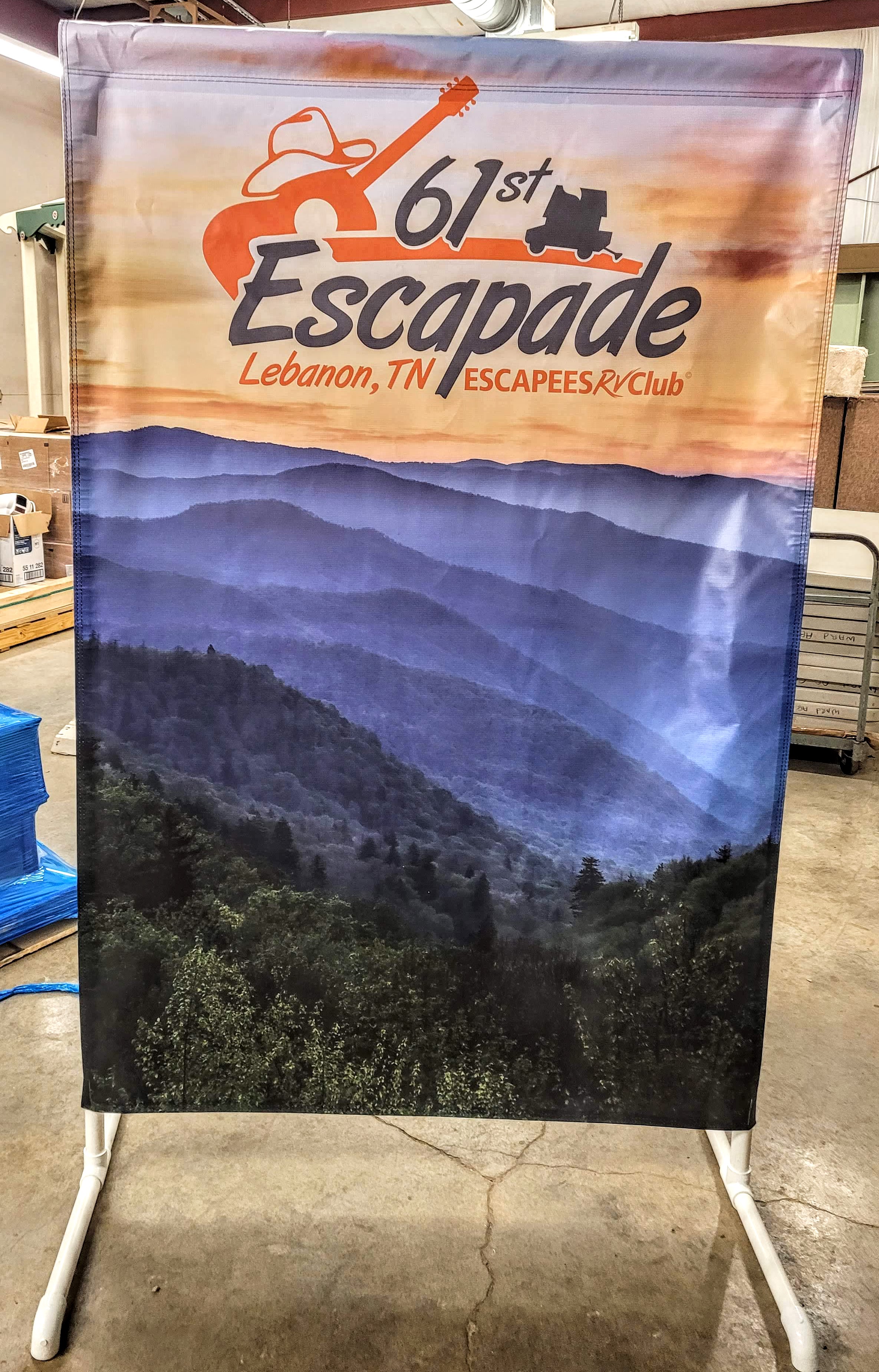 Escapade was a busy time for Carol and I. Part of our responsibilities involved getting all the banners, including the stage back drop, photo booth, stage decorations, and table decorations in place.